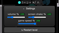 I added a settings widget, and put two important settings in there so far: screen shake: 0%-400% game speed: 20%-200% (Settings are available in the edit menu too.)...