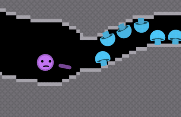 New game element! These glowing cave mushrooms pop when they're hit, doing damage in a small area. Like mines, they can burst in a chain reaction. They respawn after a little while with a cute "bwip"...